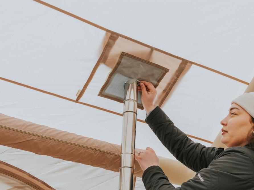 Equipped with a stove jack and AC port, allowing safe use of a wood stove for heating or portable AC for cooling in all weather.